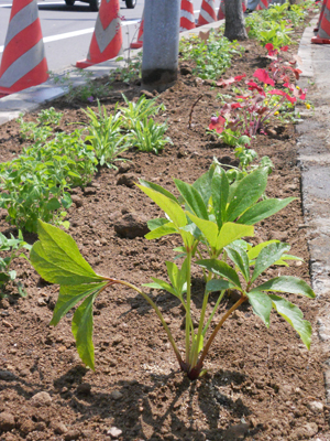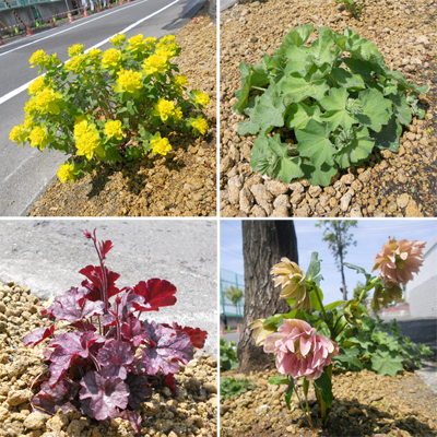 平岡循環道の緑地帯の花壇は、1年目は40m、2年目には120m、そして3年目の今年は180mと、どんどん延びてきました。以前植えた宿根草の株は徐々に大きくなっていて、緑がこんもりと育っています。