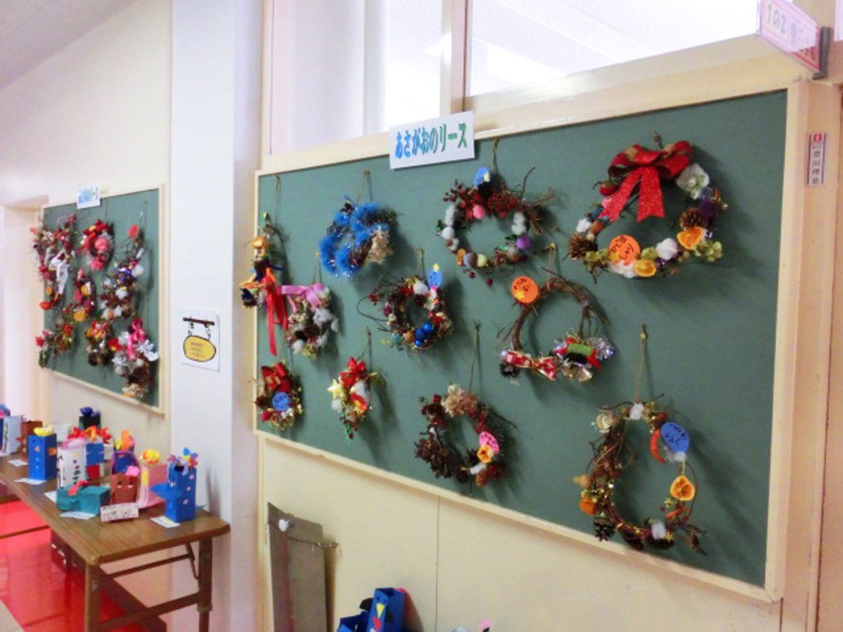 出来上がったリースの展示写真。こんなふうに学校のコーナーを楽しく彩っています。