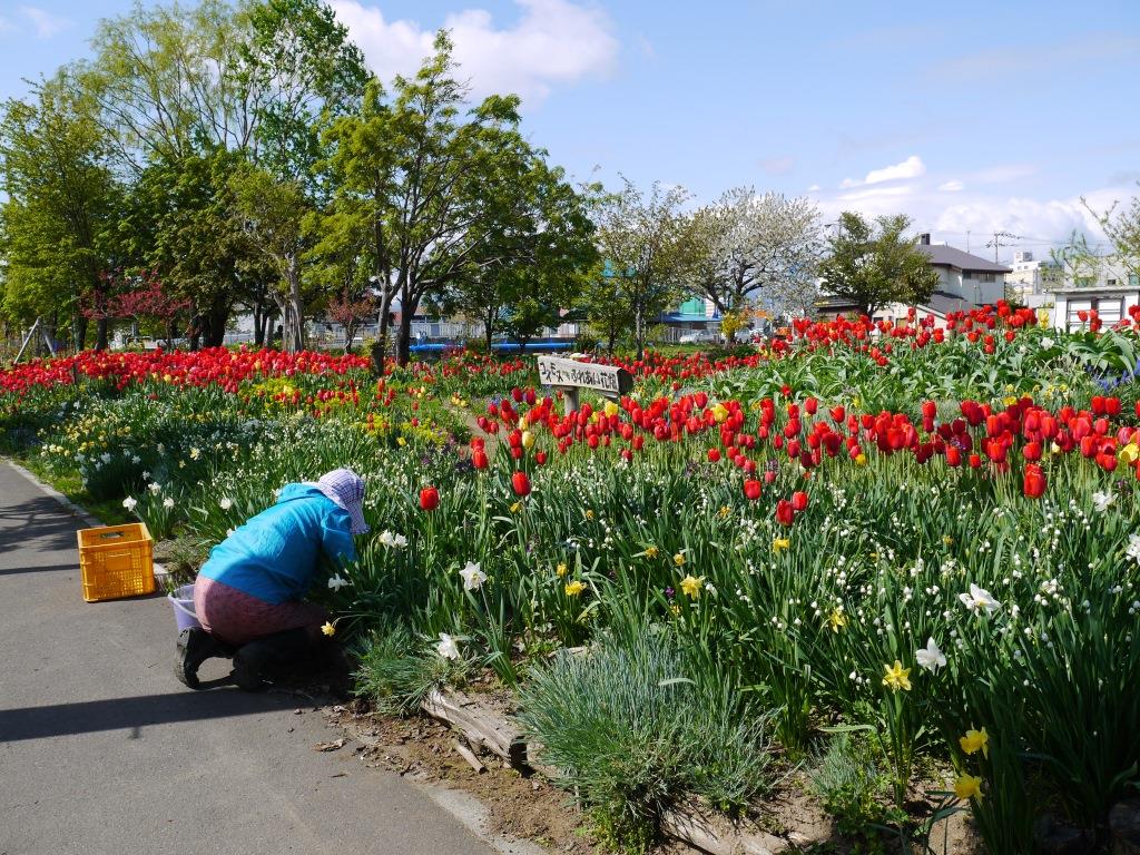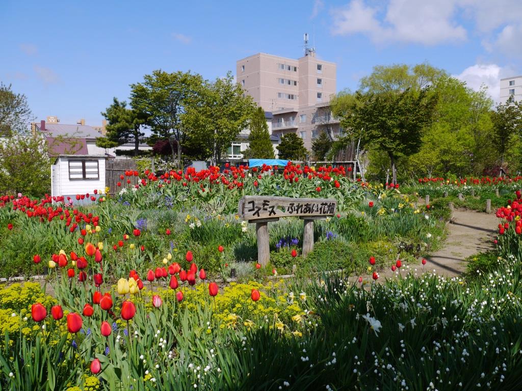 コスモスふれあい花壇という看板のあるここは、チューリップが満開でした。