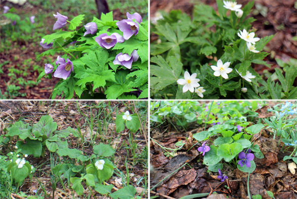 左下:オオバナノエンレイソウ、右下:タチツボスミレ