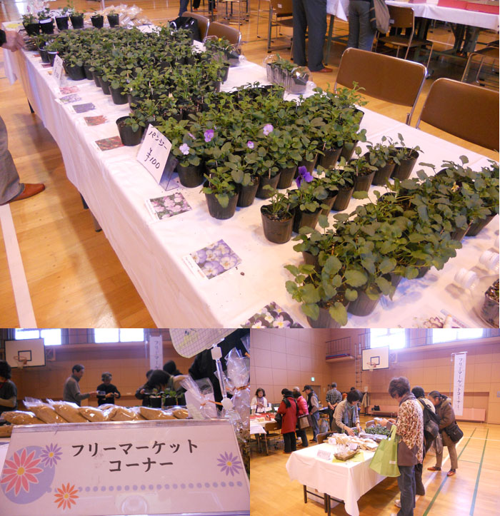 多彩なコーナーやプログラムが用意されていました。まず目を引くのが色とりどりのパンジーの苗や、EMボカシなどが並ぶ「フリーマーケットコーナー」。