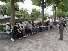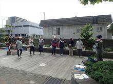 活動前に準備運動(手をぶらぶら、脚をぶらぶら、腕をまわし、膝のまげのばし)をして、体に負担がかからないように注意しているそうです。途中木陰で休憩を取り、最後に代表の髙橋さんからメンバーのみなさんに、今後の活動のお知らせや花のイベント情報などが伝えられました。