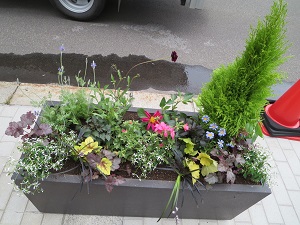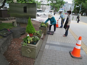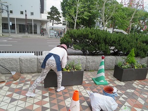 6月6日、花と緑のボランティア登録団体「あるば・ローズ」が、札幌市役所前おもてなし花壇のコンテナの植栽をしました。