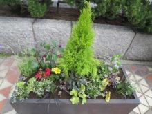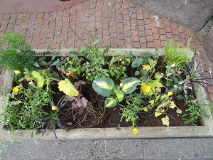まずはポットのまま植物をコンテナの上に置いてみてから、配置などを調整して植えていきます。
