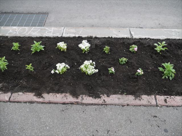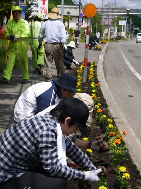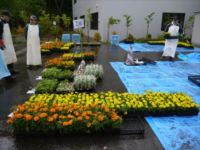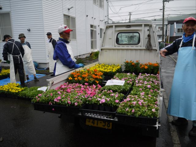 札幌南区国道453号線沿いの、長い長い両サイドの花壇です。朝6時から、早朝準備作業が始まりました。前日から水をたっぷり吸わせた苗たちをトラックに乗せ、それぞれの花壇そばに設置していきます。