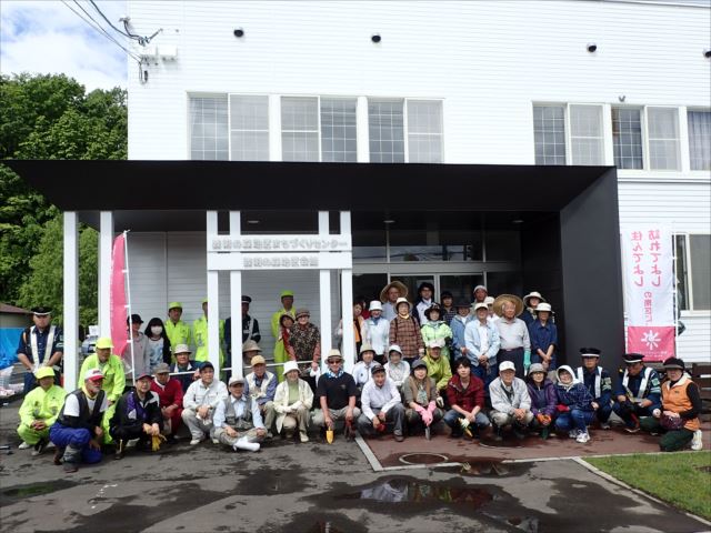 その後地域のみなさんが集まり、9時から花苗植え開始です。まちづくりセンター前で、開始前に記念撮影。