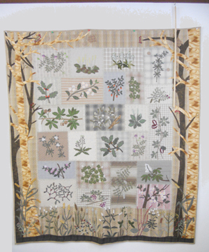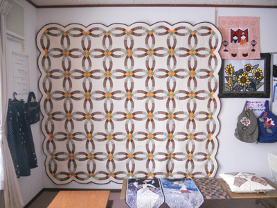 こちらの作品は、私の背丈以上の大きさです。四季の花を縫い込んだとても見事な作品です。1年ほどかけて作り上げたそうです。