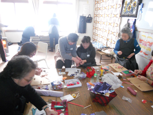 この日の手芸教室では、みんなでコサージュをつくりました。一生懸命手を動かしながら、冗談を交えつつ、さまざまな話題に花を咲かせました。楽しく会話をするには、手仕事はもってこいです。交流が深まります。冬は「話の花」が咲くんですね。