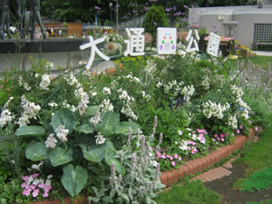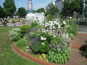 夏花壇は、白やブルーのお花にグリーンの葉が映え、さわやかな