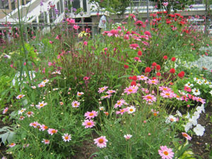花壇には、さまざまなお花が、色鮮やかに咲いています。