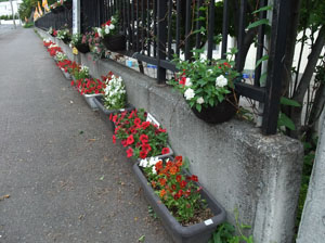 校門前には、たくさんのコンテナやハンギングバスケットが