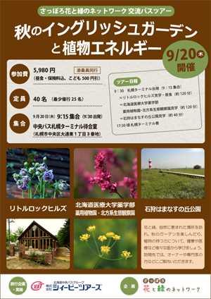 「さっぽろ花と緑のネットワーク」交流バスツアーを開催いたします。花と緑、自然に恵まれた場所を訪れ、秋のガーデンを楽しんだり、植物の持つ力について、健康や医療など様々な面から学びましょう。訪問先では、オーナーや専門家の方などにご案内いただきます。