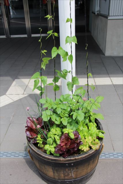 野菜が植えられている丸樽コンテナと並んで、タウンガーデナーのみなさんがデザインしてくださったものをもとに作成したお花のコンテナが市役所側に4基と、ハーブなど食べられる植物をたくさん入れたコンテナ2基がホール正面に置いてあります。