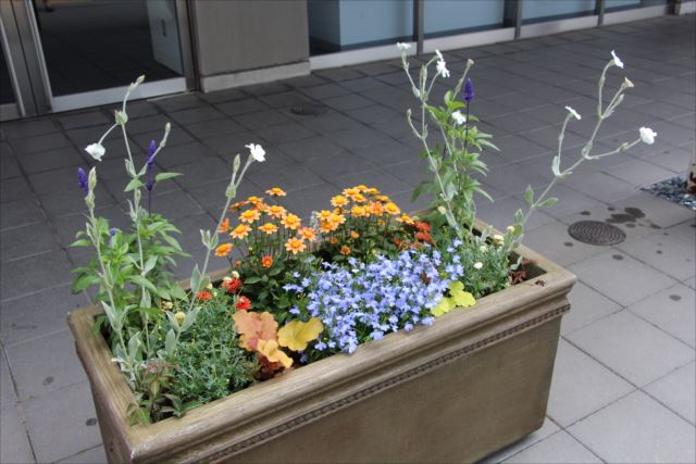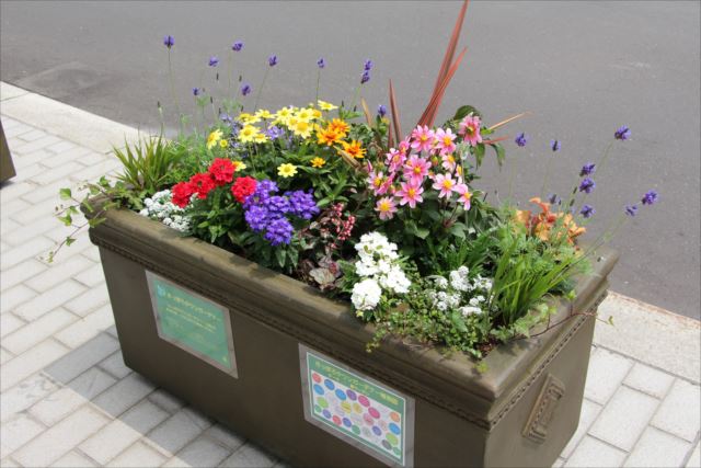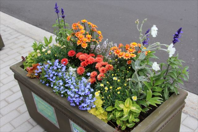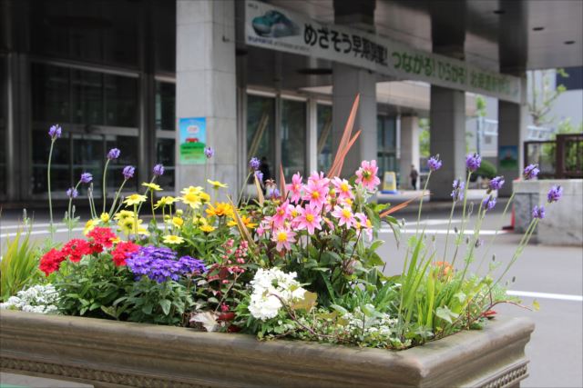 お花が色鮮やかに咲いていて、市役所前で明るくお迎えしているようです。