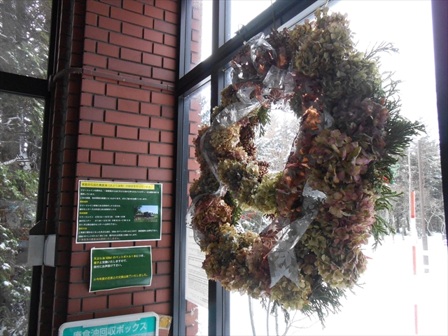 こちらはクリスマスのディスプレイ。公園内や自宅でとれた植物を使っていて、どれも個性があり素敵でした。温室のエントランスには1mほどの力作のリースも!