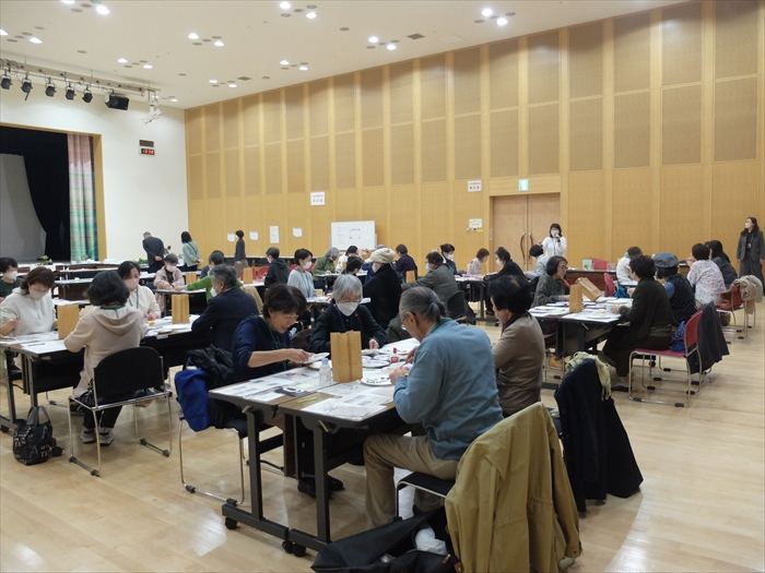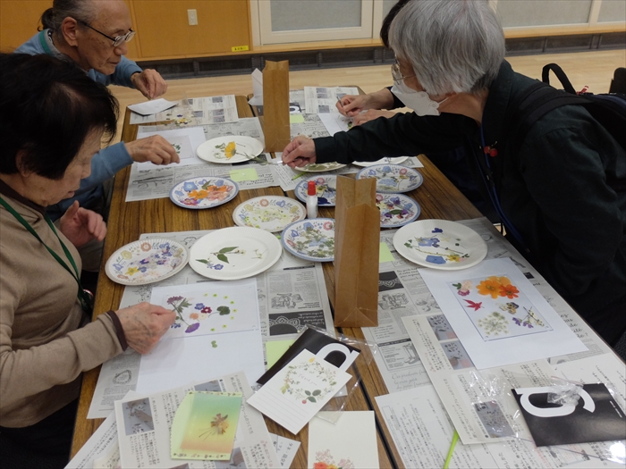 久しぶりにお会いする方と、またはじめてお会いした方とも、押し花を手にしながら会話がはずみました。開始前は広すぎるかなと心配された会場でしたが、いつの間にかにぎやかな話声でいっぱいになりました。
