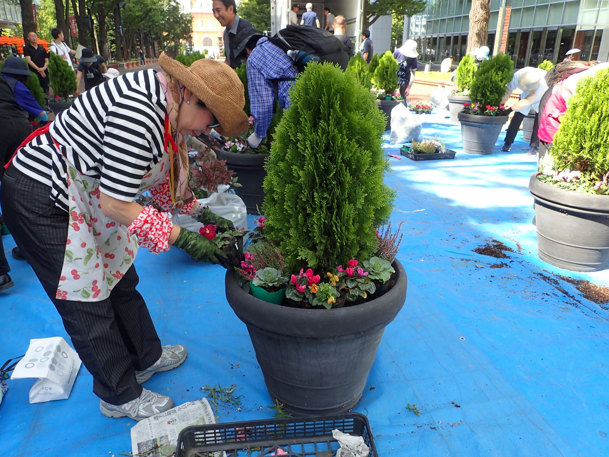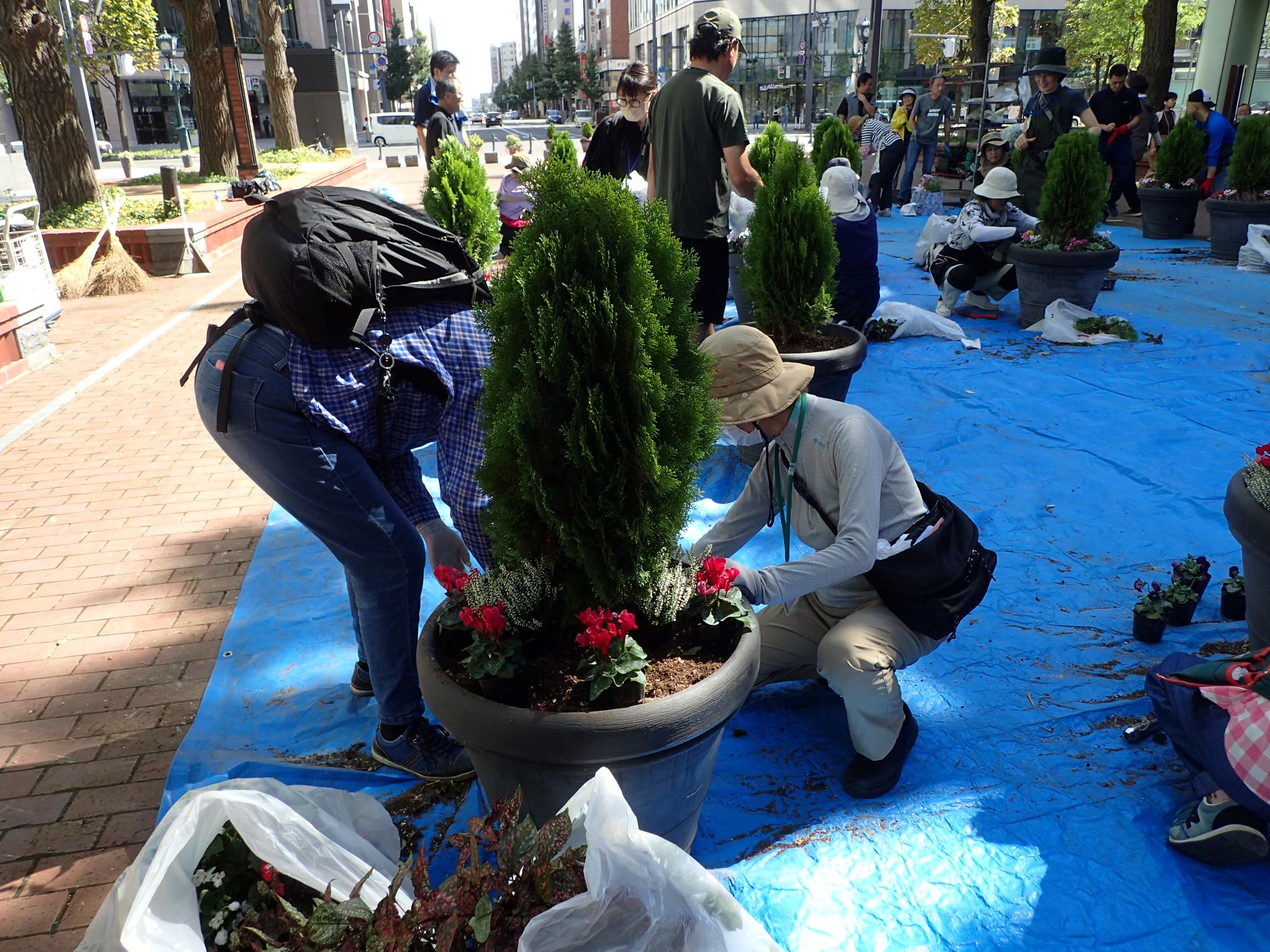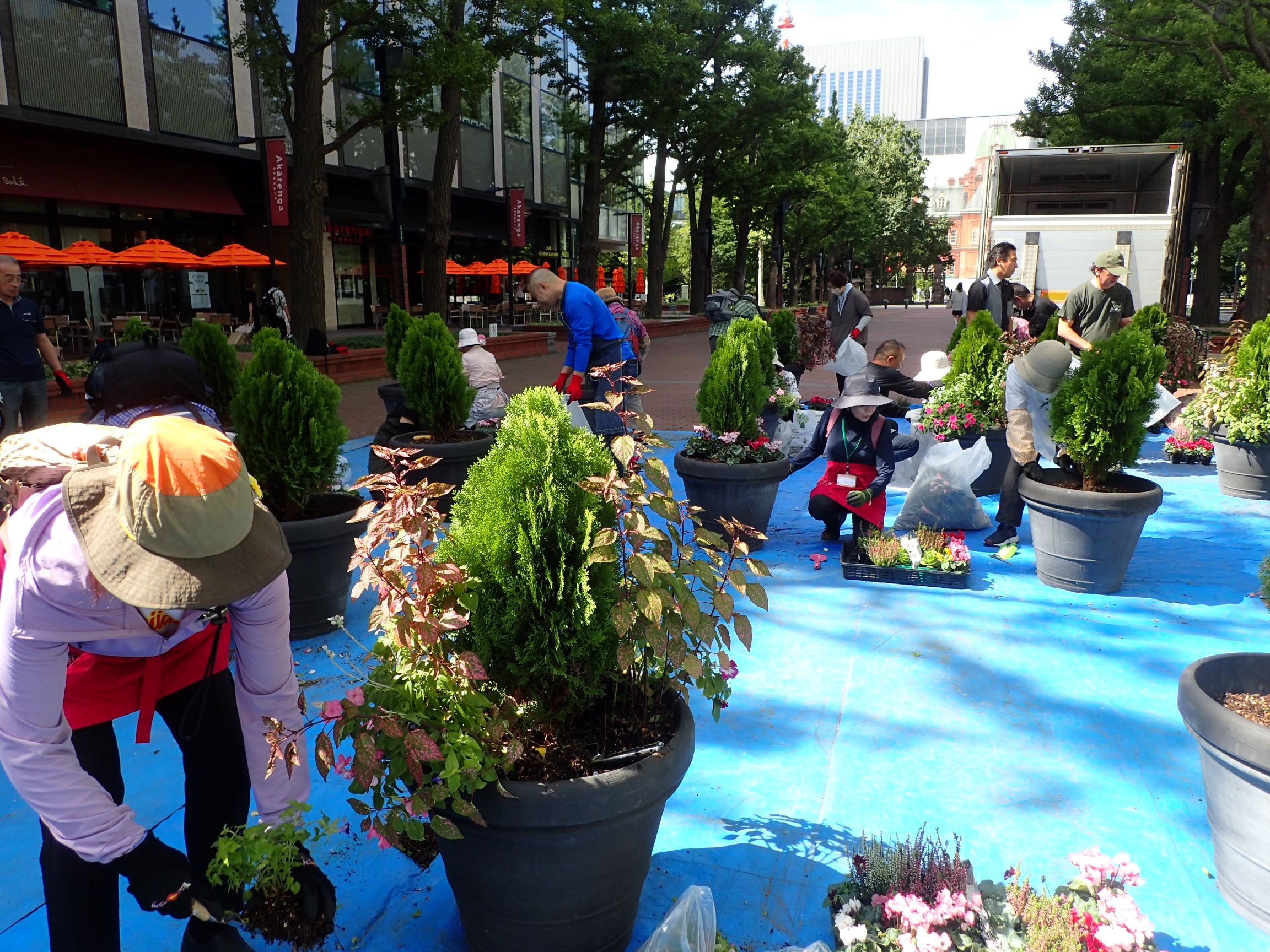 9月10日(日曜日)、北三条広場(愛称:アカプラ)にて6月から札幌駅前通りを彩っていた「札幌駅前通ストリートガーデン」のフラワープランターの花苗植替えを行いました。