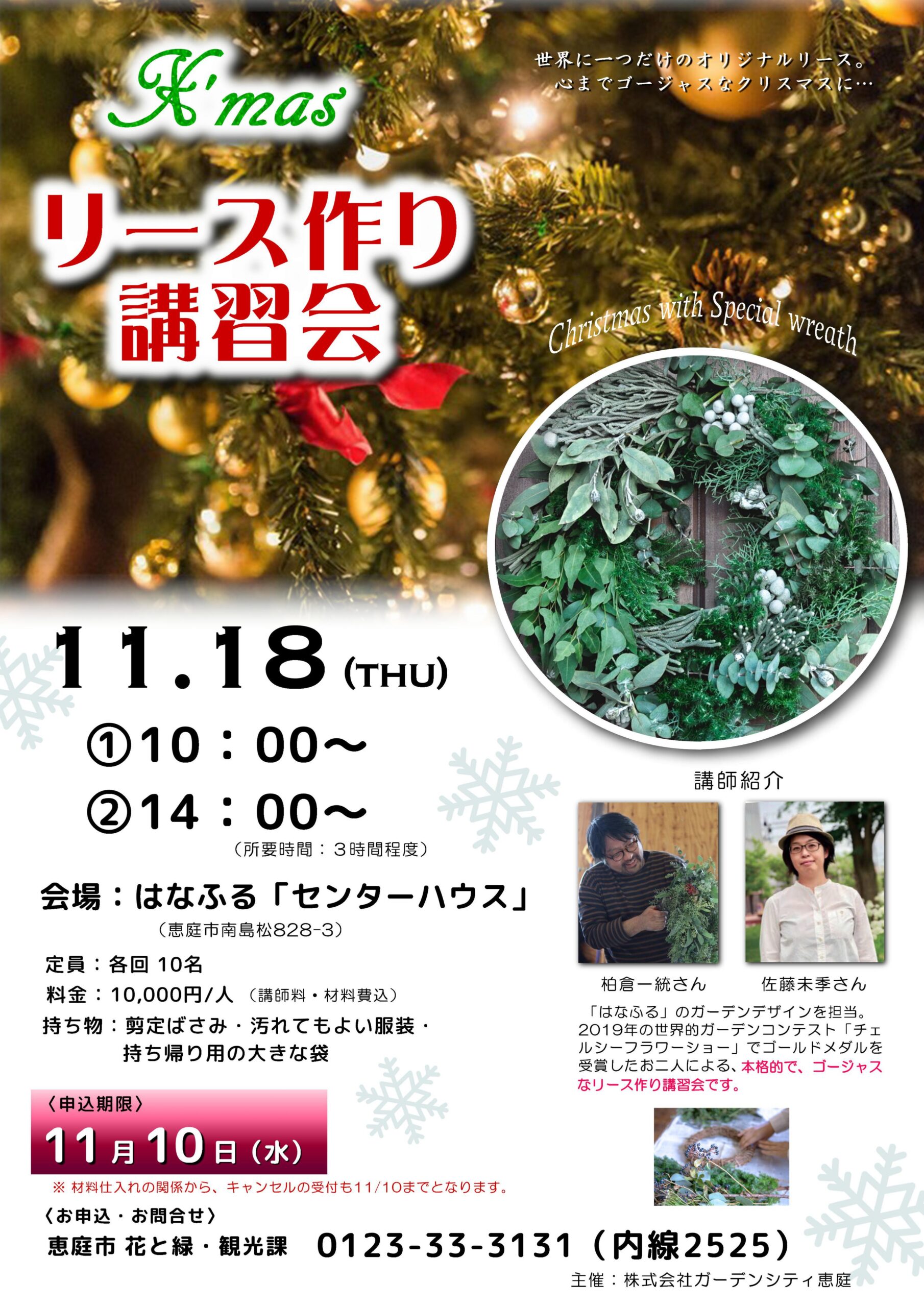 11月18日(木曜日)に第39回全国都市緑化北海道フェアのメイン会場である恵庭市「はなふる」でリースづくり講習会を開催します。