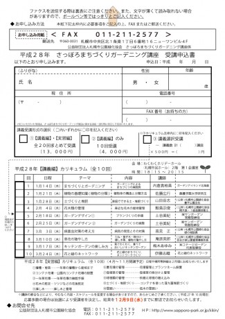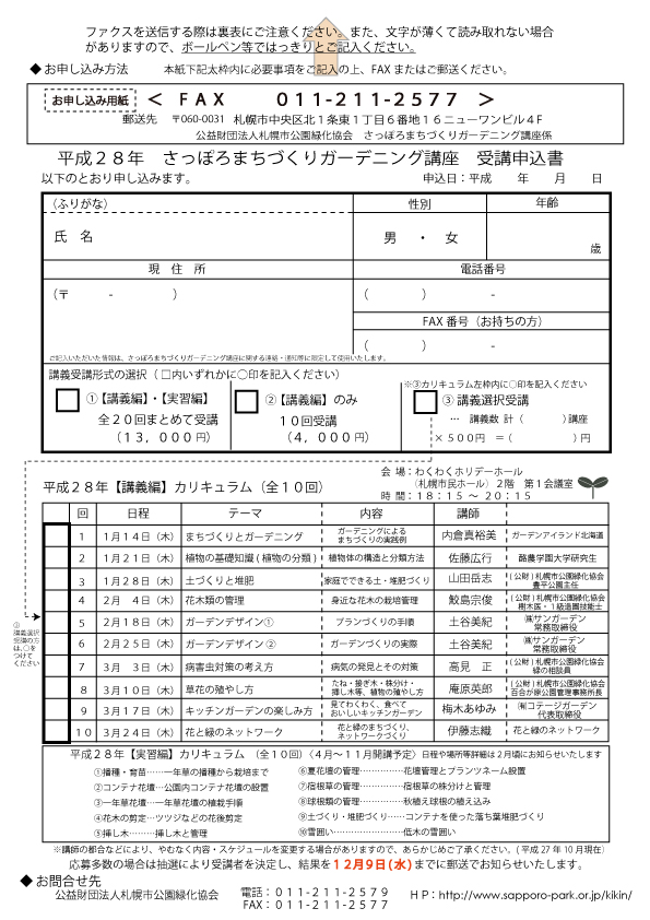 新着情報 さっぽろまちづくりガーデニング講座 講義選択受講のみ随時受付中です 2016年01月13日 花や緑を通じて社会や地域で活動するボランティア、都市緑化のサポーターの養成を目的とした「さっぽろまちづくりガーデニング講座」が明日から開講します。講義と実習のメニューがありますが、現在、講義のみ随時受け付けていますので、興味のある分野の講義がありましたら、ぜひ受けてみませんか? 講義は全10回、1つの講義500円の受講料がかかります。 ※事前申し込みが必要です。 ※定員に達し次第受付終了します。 詳しくは札幌市都市緑化基金のページをご覧ください。 Tweet 次へ 一覧へ戻る 前へ カテゴリー 新着情報 ブログ 事務局より ボランティア募集 主催イベント報告 団体活動紹介 ガーデナー紹介 関連行事ご案内 主催事業・イベント 講習会・検定試験 札幌市内の公園情報 2025-12-23 大通公園 ガイドボランティアさんの年内活動終了 2025-12-23 旭山記念公園 旭山記念公園野鳥情報2025年12月23日(火曜日) 2025-12-22 大通公園 さっぽろホワイトイルミネーション大通会場は12月25日まで 2025-12-22 滝野すずらん丘陵公園 滝野スノーワールド、明日(12/23)から開園!! 2025-12-21 前田森林公園 年末年始の管理事務所閉鎖について 2025-12-21 百合が原公園 冬至、冬中、冬始め(ミモザ苗販売のお知らせも 2025年12月21日) 2025-12-20 豊平公園 年末年始の豊平公園緑のセンター休館と駐車場閉鎖のお知らせ 2025-12-19 百合が原公園 今年最後のボランティア活動(2025年12月19日)