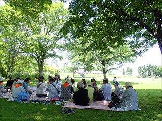 芝生広場で2つに別れたグループが合流し、木陰で座ってお茶を飲みながら交流しました。