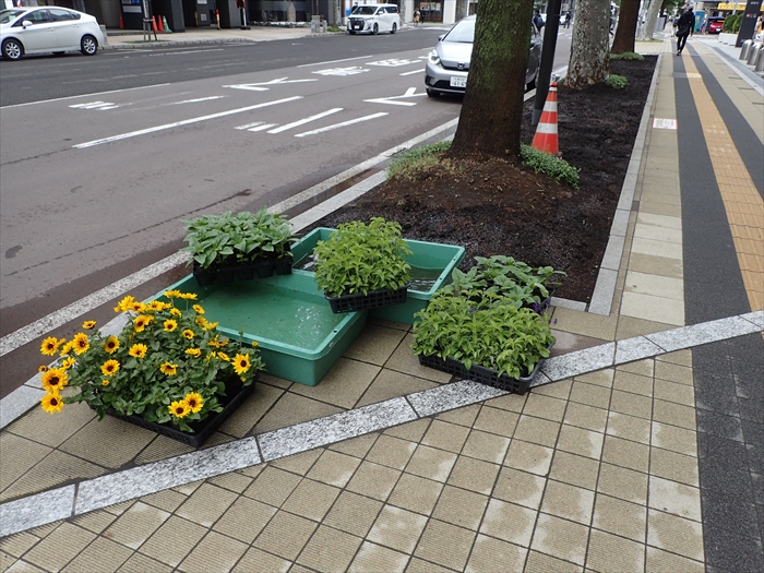 ます花壇の近くの建物寄りには樽型の大きなコンテナが6基設置されていて、昨年から北海道放送とガーデンアイランド北海道、札幌市が花植えをしており、今年はさっぽろ花と緑のネットワークも加わって、合同で花植えを行いました。
