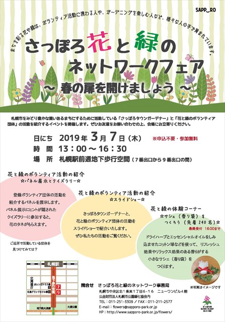 平成31年3月7日(木曜日)に札幌駅前通地下歩行空間(チ・カ・ホ)で、「さっぽろ花と緑のネットワークフェア~春の扉を開けましょう~」を開催します。