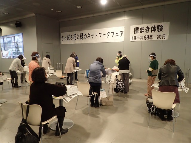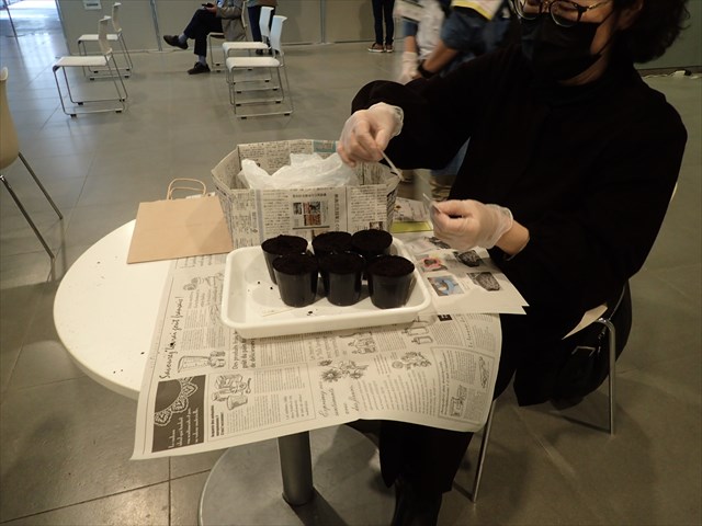 会場で行ったワークショップ「花の種まき 春に向けて、種から花を育ててみよう!」では、2回の講習会で種まきを学んだ「種まき育苗サポーター」のみなさんが参加者に種まきを丁寧に教えました。
