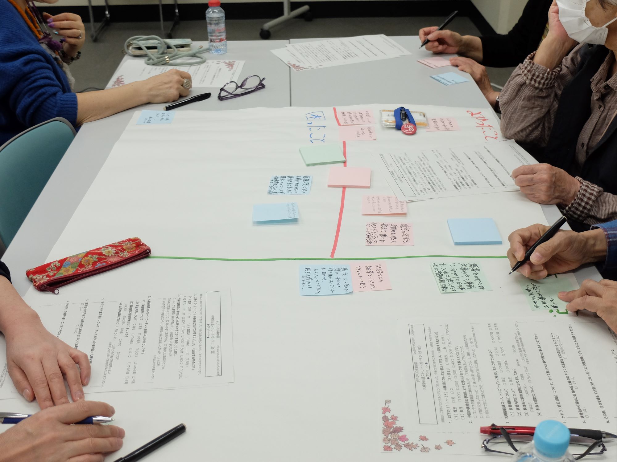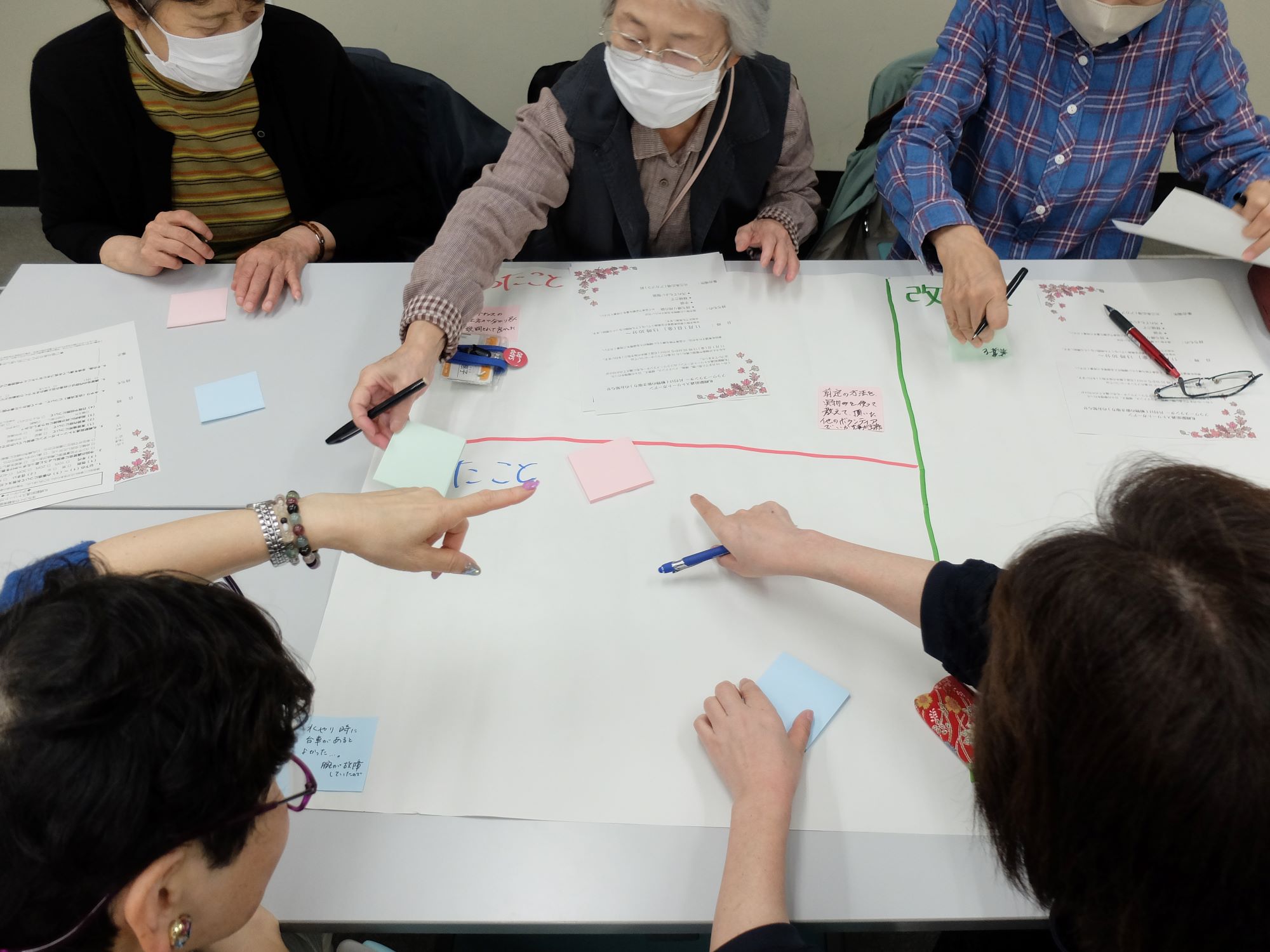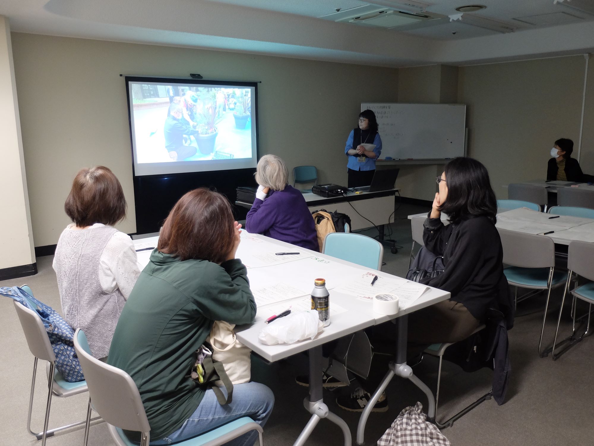 始めはなかなか意見が思い浮かばない様子の方も、同じグループの人とおしゃべりするうちに筆が進んだり、「お花が好きな人とこうやって話ができるだけで良かった」といった声も聞こえる和やかな雰囲気のなか、振り返りました。
