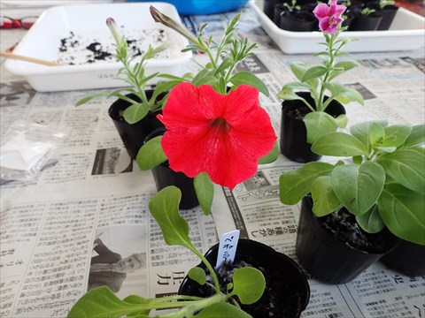 今回の講習会で参加者に教えるために、ポットあげ実習用のペチュニアの苗と、摘心実習用のペチュニアとマリーゴールドの苗を自宅で育てて用意しました。なかには2月13日にポット上げをしたペチュニアが育ち、花が咲いているものもありました。