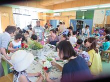 器が出来たらオアシスをセットし、お花を挿していきます。「カルガモみどりの会」のメンバーがご自宅から持ってきてくれたお花も加えて、アレンジメントを作りました。アルケミラモリスの葉っぱを触って「フワフワだよ!」と驚く子どももいて、新鮮な発見もあったようです。