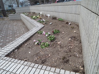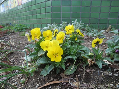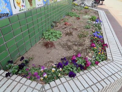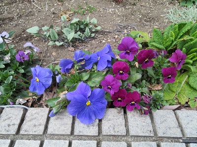 花壇には、昨秋に植えたパンジーやビオラが無事に越冬し、かわいいお花を咲かせて