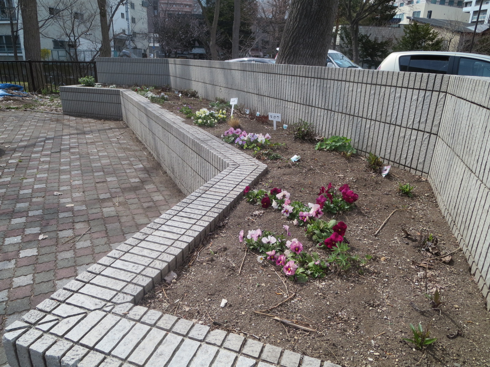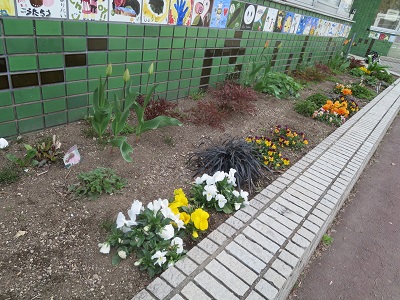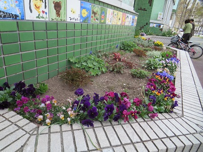 4月28日の中島児童会館の花壇の様子です。宿根草の葉が茂ってきました。また、パンジー、ビオラがにぎやかに咲きそろいました。