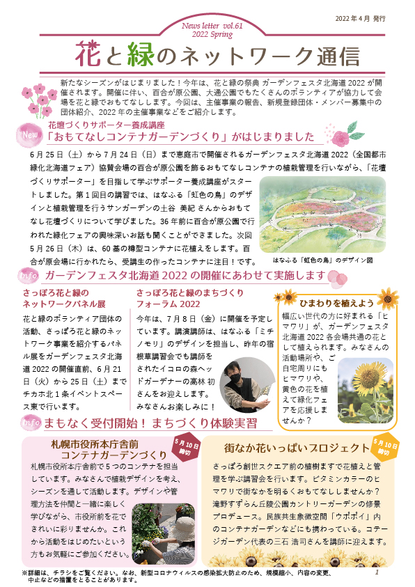 今回は、ガーデンフェスタ北海道2022の開催にあわせた事業の紹介、2022年度のさっぽろ花と緑のネットワーク主催行事のご案内、新規登録団体の紹介、メンバー募集中のボランティア団体のご紹介などを掲載しています。