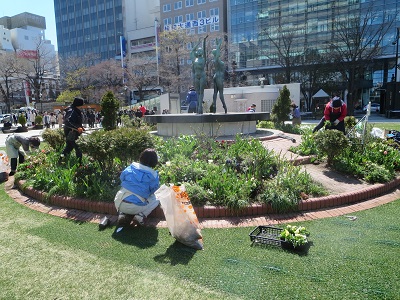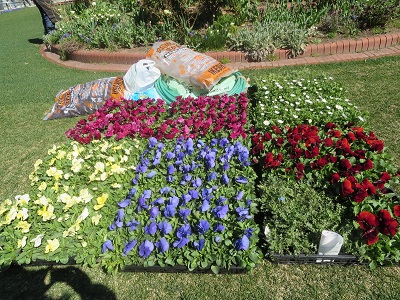 西3丁目泉の像花壇で、パンジーやネモフィラなど春の花苗の植え込みをしました。