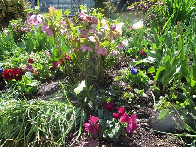 すでに咲いていたクリスマスローズなどの宿根草と、今回植えた花苗がお互いを引き立て