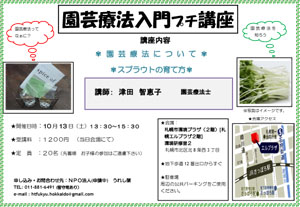新着情報 関連行事ご案内 園芸療法入門プチ講座 第3回のお知らせ 2012年08月30日 園芸療法入門プチ講座の第3回目が開催されます。園芸療法に関心のある方、 ぜひ受講されてはいかがでしょうか? 詳しくは、チラシをご覧ください。 クリックすると拡大できます。 Tweet 次へ 一覧へ戻る 前へ カテゴリー 新着情報 ブログ 事務局より ボランティア募集 主催イベント報告 団体活動紹介 ガーデナー紹介 関連行事ご案内 主催事業・イベント 講習会・検定試験 札幌市内の公園情報 2025-12-23 大通公園 ガイドボランティアさんの年内活動終了 2025-12-23 旭山記念公園 旭山記念公園野鳥情報2025年12月23日(火曜日) 2025-12-22 大通公園 さっぽろホワイトイルミネーション大通会場は12月25日まで 2025-12-22 滝野すずらん丘陵公園 滝野スノーワールド、明日(12/23)から開園!! 2025-12-21 前田森林公園 年末年始の管理事務所閉鎖について 2025-12-21 百合が原公園 冬至、冬中、冬始め(ミモザ苗販売のお知らせも 2025年12月21日) 2025-12-20 豊平公園 年末年始の豊平公園緑のセンター休館と駐車場閉鎖のお知らせ 2025-12-19 百合が原公園 今年最後のボランティア活動(2025年12月19日)