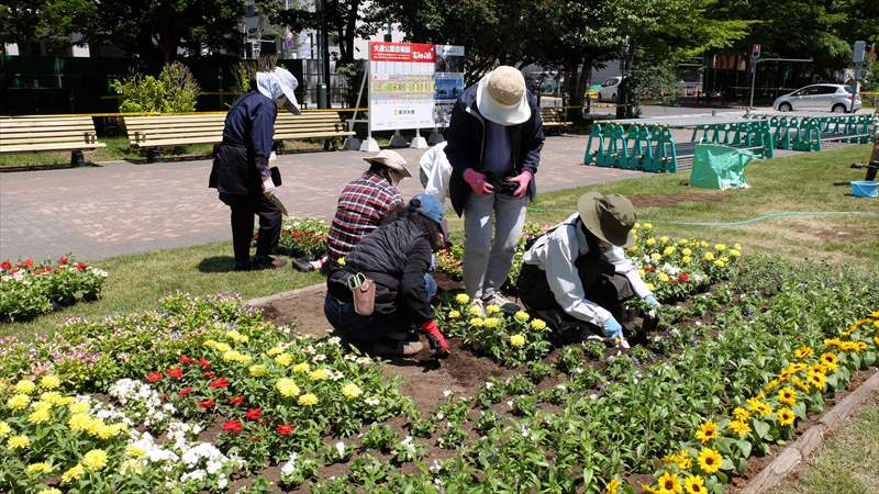 大通公園西7丁目のます花壇2面にさっぽろタウンガーデナーのサポーター養成講座修了生の有志10名と花苗を植えました。