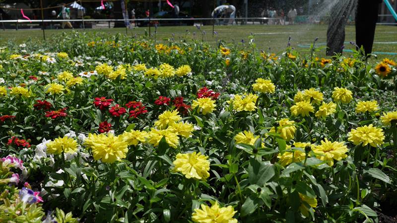 ます花壇の土の上に配置されていたのは、ジニア、ひまわり、インパチェンスなど2面合わせて1200株の花苗。
