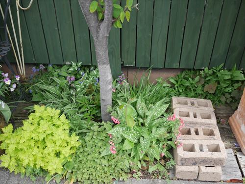 地面を這って覆い隠すグランドカバー植物ではなく、ギボウシやブルンネラのように全体にこんもりと成長する宿根草の葉が地面を覆っているので全体に立体的です。