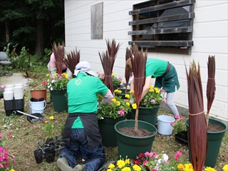 ハンギングバスケット北海道支部の事務局から東さん、制作には山本さん、木島さんと3名のタウンガーデナーも参加していました。