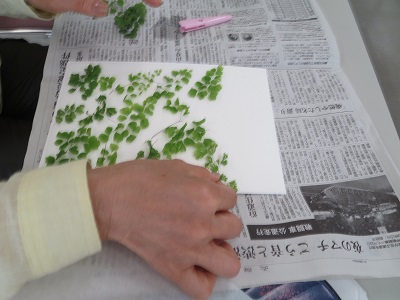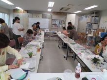 自己紹介の後、イベントの概要について事務局から説明し、その後はイベントの体験ブースで実施する予定の押し花クラフトに使う押し花を作りました。