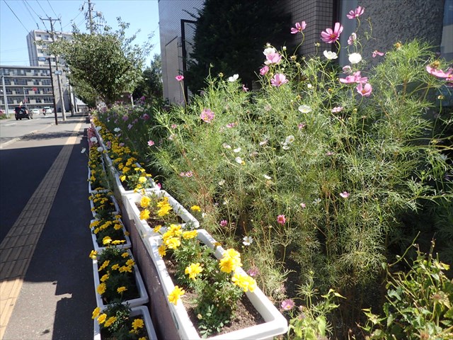手稲老人福祉センターは、登録団体「ライラックサークルボランティア会」の活動場所ですが、今シーズンは活動を休止しているため、プランターの花は職員さんが管理しているそうです。例年通りコスモスが咲き、マリーゴールドが華やかに咲いていました。