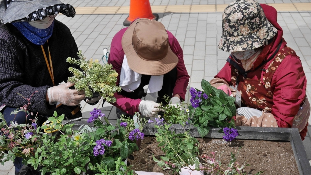 花壇に植える植物を手入れするようす