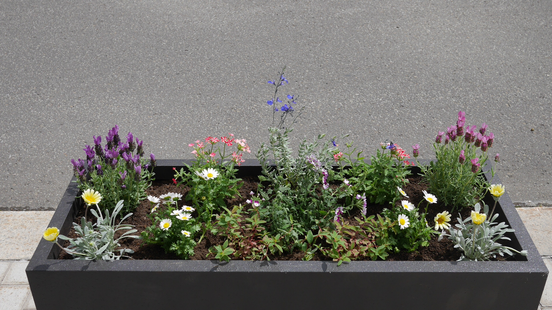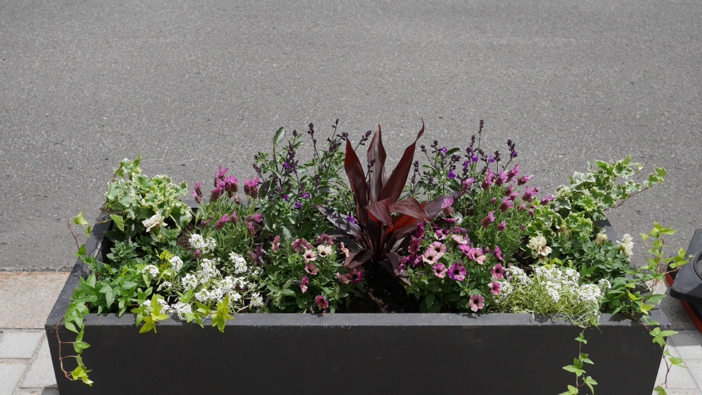ラベンダー、ペチュニアなどのコンテナ