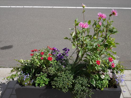 手前にダリアとナデシコを植え、ロベリアの欠けたところはギボウシで補いました。