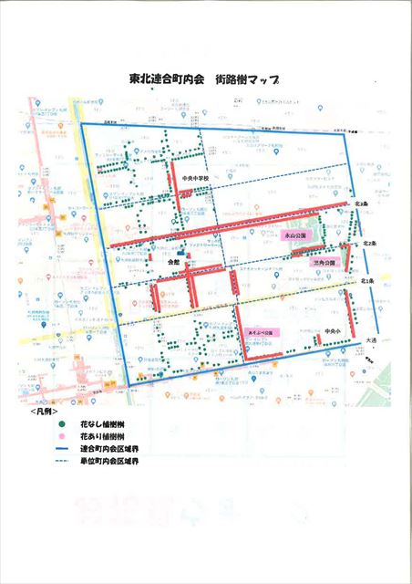 上の地図の、青枠が連合町内会の区域、赤い部分が花植えをする場所です。東西に長い北3条通りでは、990株が使われましたが、たくさんの人手があり、約30分で終了しました。
