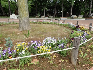 もう一つの円形花壇のビオラも数回に分けて切り戻しをしています。花が途切れずにしばらく維持できそうです。