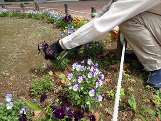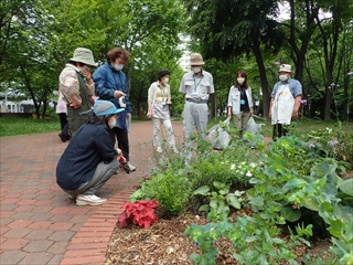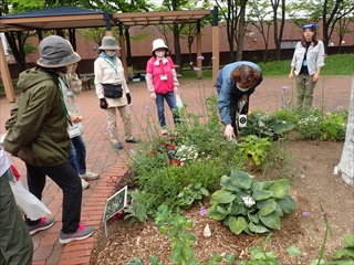 この日は、花壇のデザインをした「あるば・ローズ」の渋谷邦子さんを講師に迎えてメンテナンス講習会を行いました。花壇に植栽されている植物ひとつひとつについて今後の管理の仕方を教わりました。その後早速メンテナンスを行い、「まだ咲いている花を切るのが可愛そう」、「切り戻しの場所がわからない」と戸惑っていたみなさんですが、講師に切る意味や具体的に切る場所を教わりながら丁寧に1株1株にハサミを入れました。