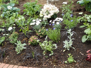 和洋折衷の旧永山邸の雰囲気、大きな樹木に囲まれている周囲の環境、近くの遊具に子どもがたくさん遊びに来る公園であることを考慮して花色を選び、また花が終わった後のシルバーや白っぽい葉の色やギザギザ、丸など葉の形を多様に取り合わせていることを渋谷さんに教えていただきました。