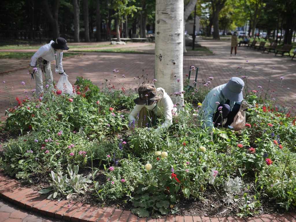 まずは、円形花壇の花がら摘み、切り戻し、落枝落葉の除去などのメンテナンスを行いました。